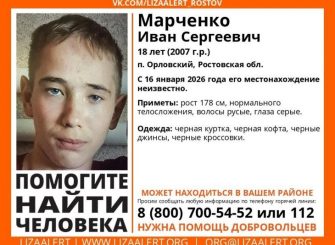 В поселке Орловском продолжается поиск 18-летнего Ивана Марченко, который пропал 16 января 2026 года.