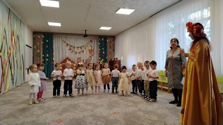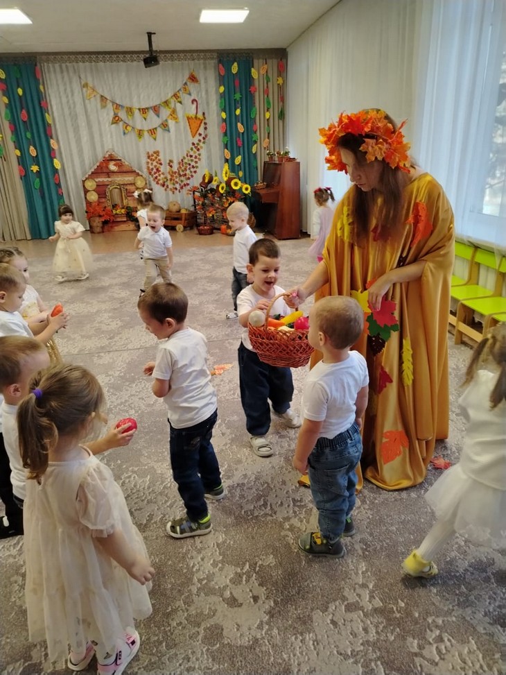 В конце октября младшая группа «Ромашка» детского сада «Улыбка» г.Пролетарска погрузилась в атмосферу осеннего волшебства на празднике «Волшебница осень». Музыкальный зал наполнился теплом и радостью, ведь к ребятам в гости пожаловала сама хозяйка осени. Ребята с удовольствием читали стихи, посвящённые осени. Танцевали с листочками, пели песни: «Осень, осень к нам пришла», «Тише, тише, тишина». Отгадывали загадки и играли с осенью в игры «Солнышко и дождик» и «Собери овощи и фрукты». На прощание осень подарила ребятам корзинку с фруктами.