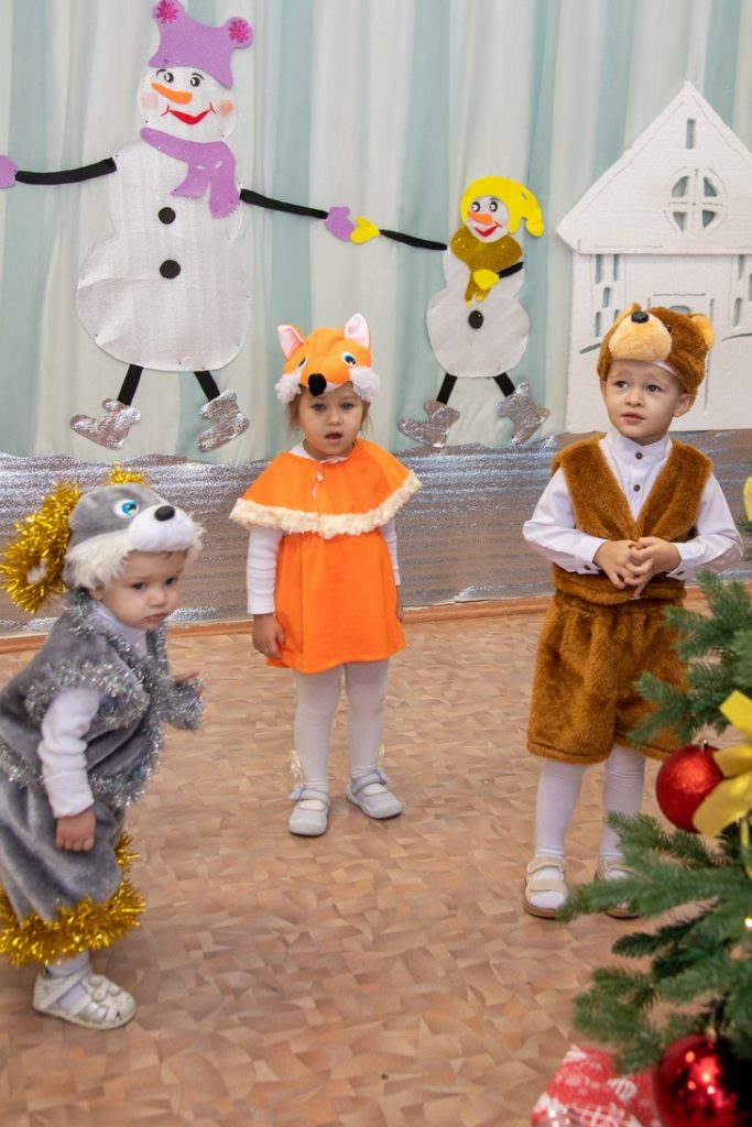 Малыши веселились у нарядной ёлочки с добрым Дедушкой морозом, красавицей Снегурочкой, шустрым зайчиком и весёлым Снеговиком. Они водили с ними хороводы, играли в снежки, танцевали. Вместе с зайчиком наши маленькие зверята отплясывали весёлый танец.
