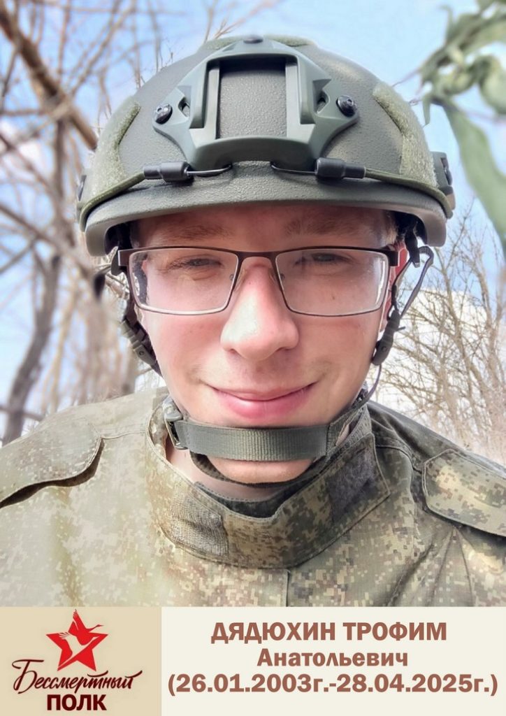 С конца апреля боец числился пропавшим без вести, опознан среди погибших в октябре. Ценой собственной жизни ветеран боевых действий Дядюхин Трофим Анатольевич выполнил воинский долг с честью и мужеством, в борьбе с фашистской диктатурой продолжив дело своего прадеда, погибшего на той же земле в далёком 1943-м.