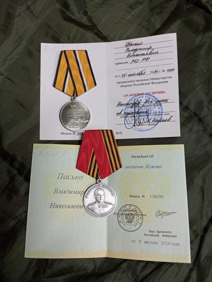 Указом Президента Российской Федерации от 8 августа 2024 года наш земляк, мобилизованный участник СВО, дважды раненный, рядовой 36 бригады 29 армии Владимир Пасько из г.Пролетарска награждён медалью Жукова.