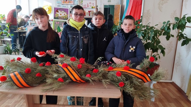 Гирлянду ребята украсили искусственными гвоздиками и георгиевской лентой, которая возложена к братской могиле советских граждан, расстрелянных немцами в августе-ноябре 1942 года и захороненных в бывшем каменном карьере.