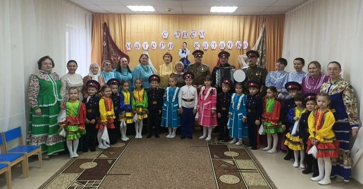 В детском саду «Звёздочка» г.Пролетарска 4 декабря, в День матери–казачки, собрались в зале любимые мамы, ведь у большинства из нас казачьи корни. Юные казачата старшей и подготовительной групп исполнили для них песни, казачьи танцы, читали стихи, рассказывающие о любви, заботе и гордости за свою семью и народ. Сюрпризом для ребят и родителей стало выступление народного фольклорного ансамбля «Станица» (рук.Эдуард Минор), которые исполнили для ребят казачьи старинные походные и лирические песни, а ещё рассказали об истории казачьего костюма.