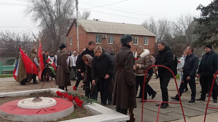 Представители районной и городской администраций, их отделов и структурных подразделений, организаций и учреждений города, общественных и партийных формирований, молодогвардейцы, а также жители города приняли участие в возложении венков и цветов к Мемориалу погибших воинов в центре города.