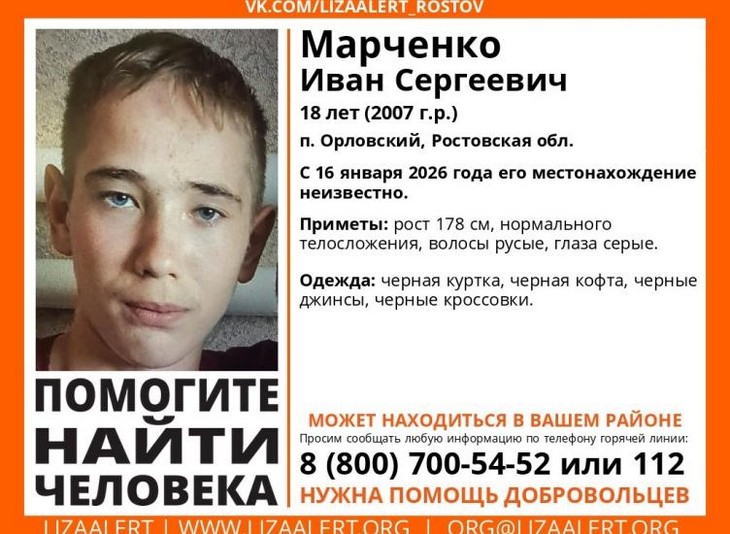 В поселке Орловском продолжается поиск 18-летнего Ивана Марченко, который пропал 16 января 2026 года. Об этом сообщили в поисковом отряде «ЛизаАлерт» Ростовской области.