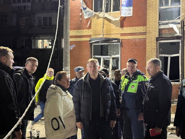 Взрывотехники завершили обследование многоквартирного дома на Западном шоссе: несущие конструкции не нарушены, жителям разрешено вернуться в квартиры. На улице Октябрьской сапёры продолжают осмотр территории — повреждены торговые павильоны, автомобили и здание частного медцентра.