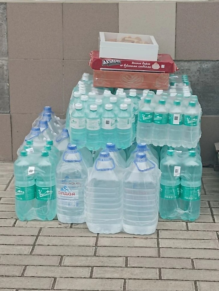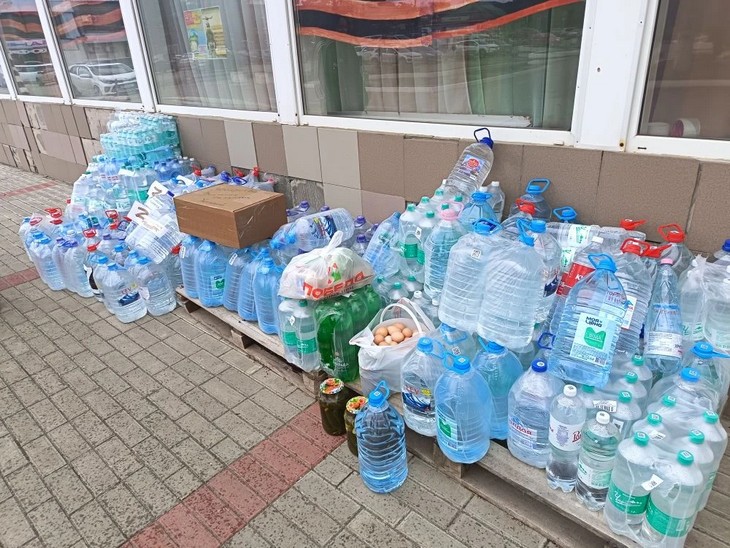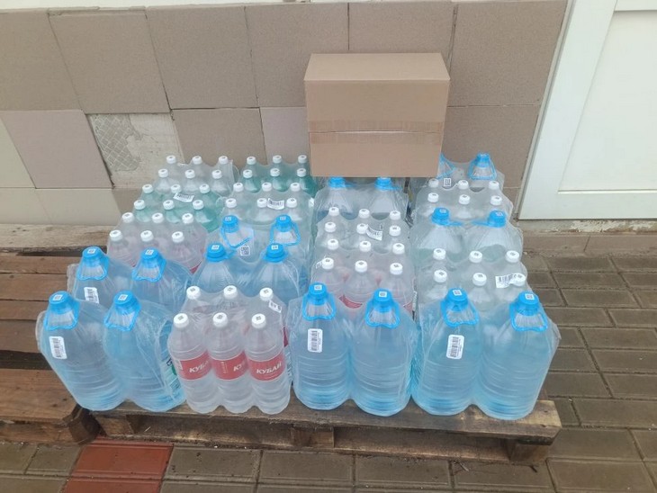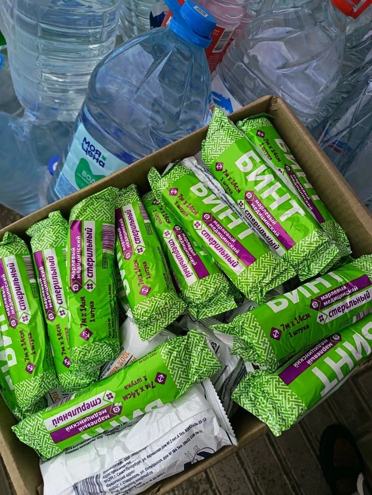 Помимо воды, волонтёры собрали и отправили важнейшие медицинские средства: обезболивающие и заживляющие мази (включая Левомеколь), антибиотики в таблетках, парацетамол, термоодеяла, гемостатическая тампонада, шприцы 5 куб, успокоительные средства (валериана, пустырник, глицин).